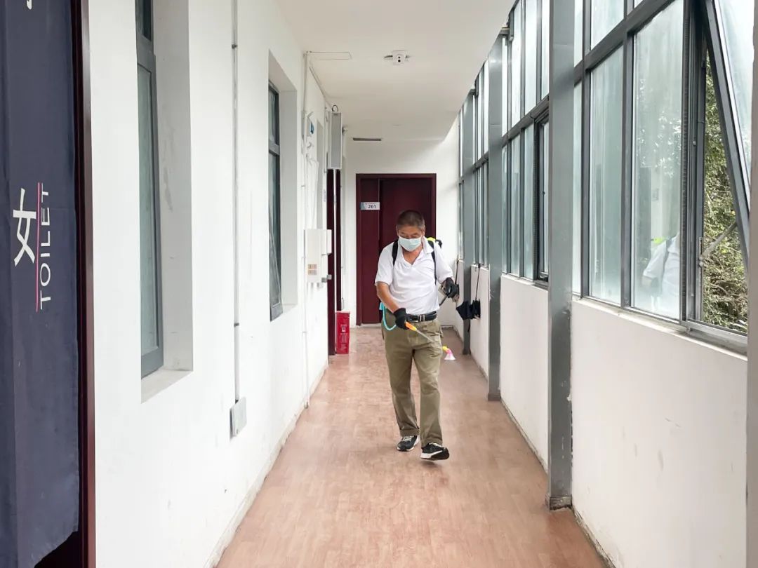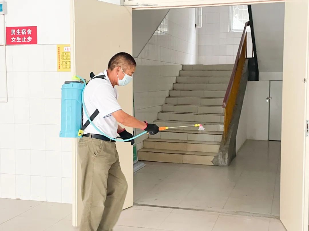 消杀过程中,工作人员严格按照科学比例进行喷雾剂配兑,身背消毒设备,对教学楼、食堂、卫生间、走廊、楼梯等场所进行“地毯式全覆盖”消毒杀菌除虫。
