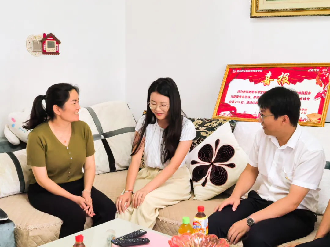 校领导们带着满满的祝福和喜悦来到程静怡同学的家中。当程静怡和她的家人看到校领导亲自上门时,脸上洋溢着惊喜和感动。校领导将精心准备的喜报和奖品交到她的手中,并对她取得的成绩表示热烈的祝贺。校领导在与程同学及其家人的交流中,充分肯定了程同学在学校的优秀表现,对她的努力和付出给予了高度赞扬。同时,校领导也感谢了家长对学校教育工作的支持和配合,强调了家庭在学生成长过程中的重要作用。