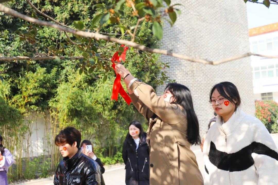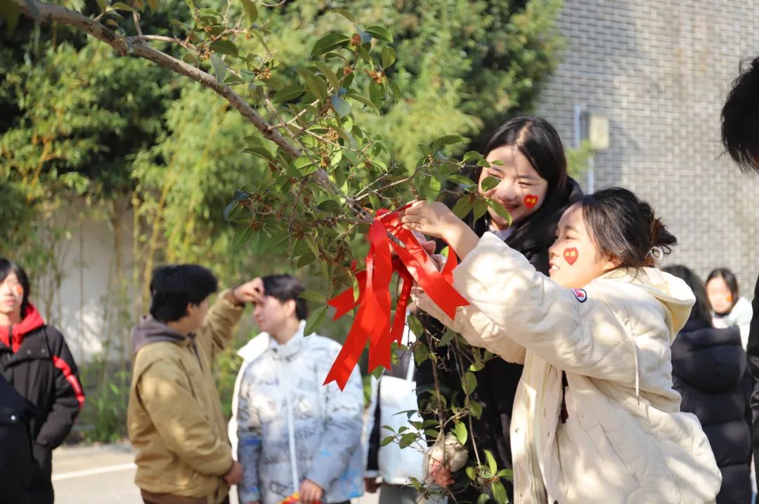 稍后同学们将手腕上的红色丝带取下,真诚的写上联考心愿,承载心愿的红丝带在这一刻变的颇具意义,一起携手将其系在学校的桂花树上。有梦想谁都了不起,此刻厉兵秣马,他日雄踞金榜,再拼搏短短的十天,成功在望,相信自己,百炼成钢。
