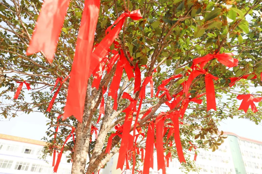 校领导们为每一位即将奔赴考场的学子们系上印有“加油!必胜!”的红丝带,送上他们诚挚的祝福。青春如风一般肆意奔跑,如星一般璀璨夺目。系在腕间的红丝带随风飘动,愿所有人也能像红丝带一般,去追寻自己心中的星辰大海。