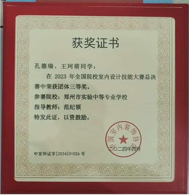 本次赛事属于全国院校室内设计专业最高规格的技能大赛,分中职组、高职组、本科组三个组别。经过激烈角逐,我校室内32201班的孔德瑞、王珂萌两位同学获得中职组团体三等奖,范纪领老师获得优秀指导教师奖。
