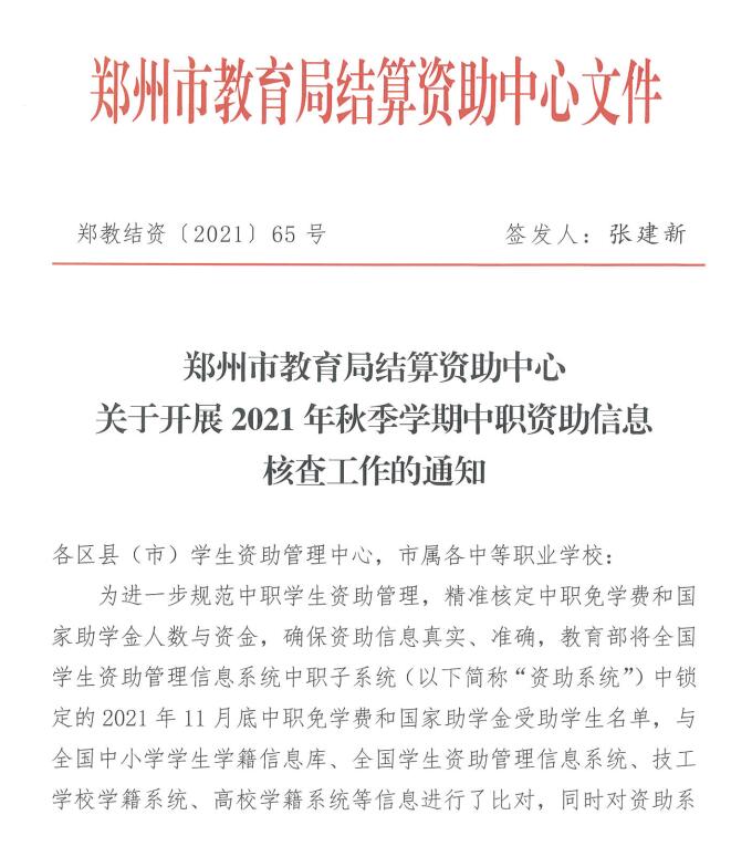 郑州市教育局结算资助中心关于开展2021年秋季学期中职资助信息核查工作的通知