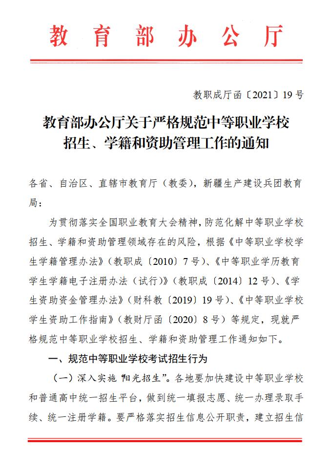 教育部办公厅关于严格规范中等职业学校招生、学籍和资助管理工作的通知