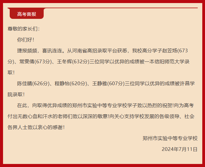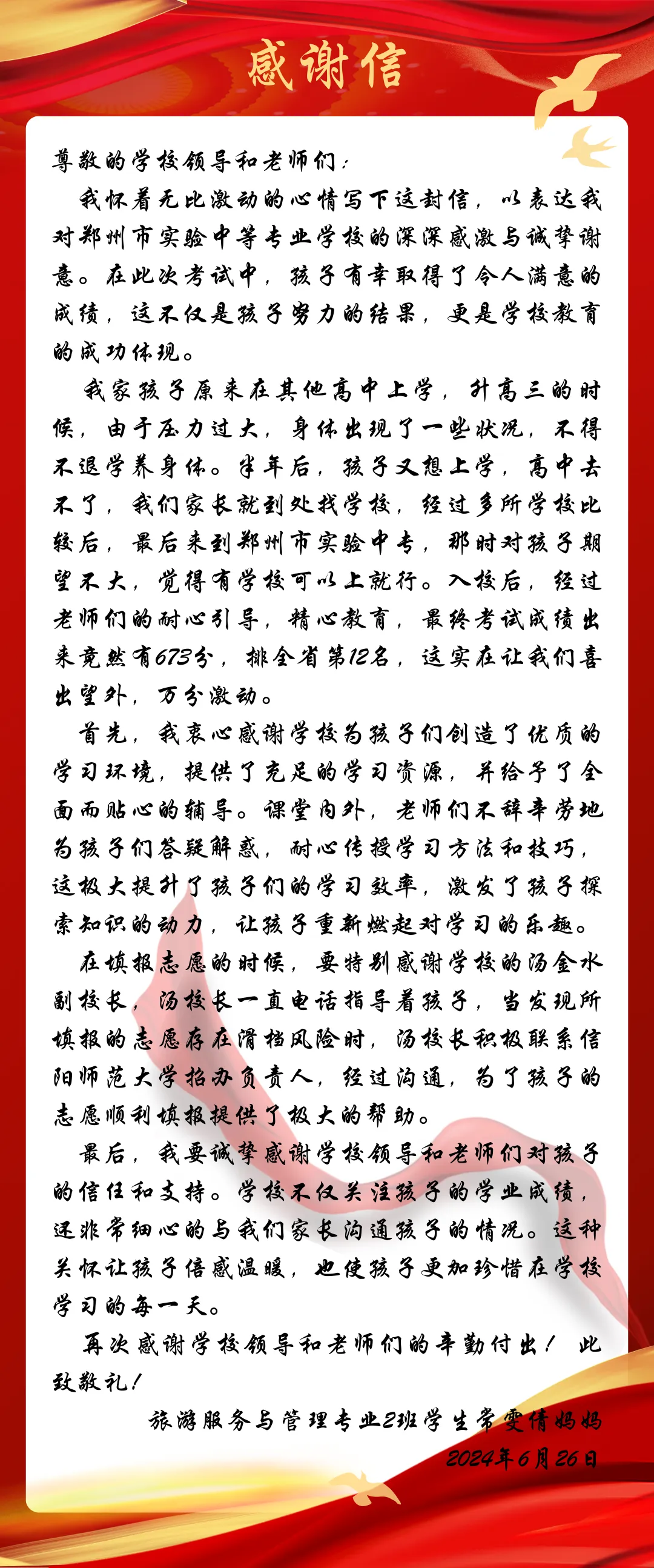 部分高考学生及家长致郑州市实验中等专业学校的感谢信