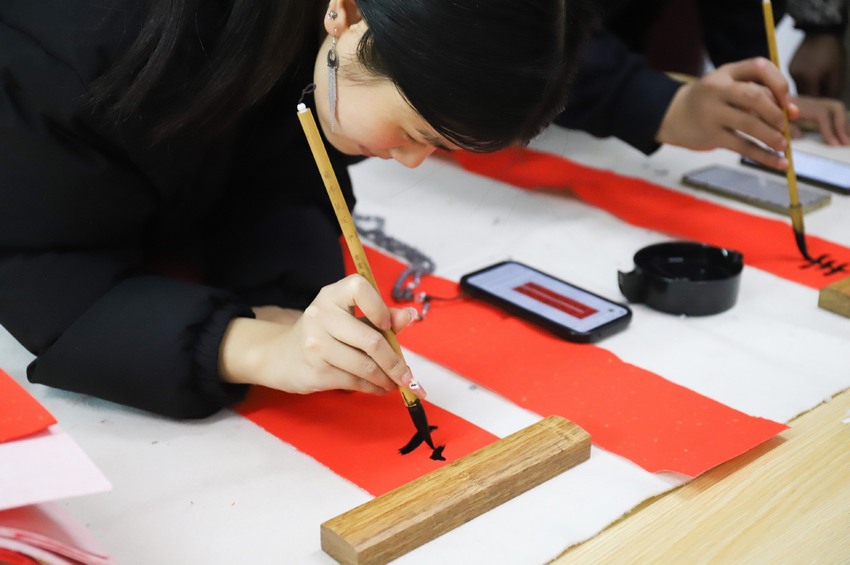 活动当天,校园内弥漫着浓浓的墨香。在创美π社团的教室里,老师和同学们一同沾墨、提笔、挥笔、收笔,如行云流水,将自己对新年的美好祝愿融入到一笔一划中。有的同学写下了“福满人间”,有的写下了“吉祥如意”,还有的写下了“学业进步”等美好祝福。这些春联不仅展现了同学们对幸福生活的深情赞美,更饱含了大家对新年的热切期盼。