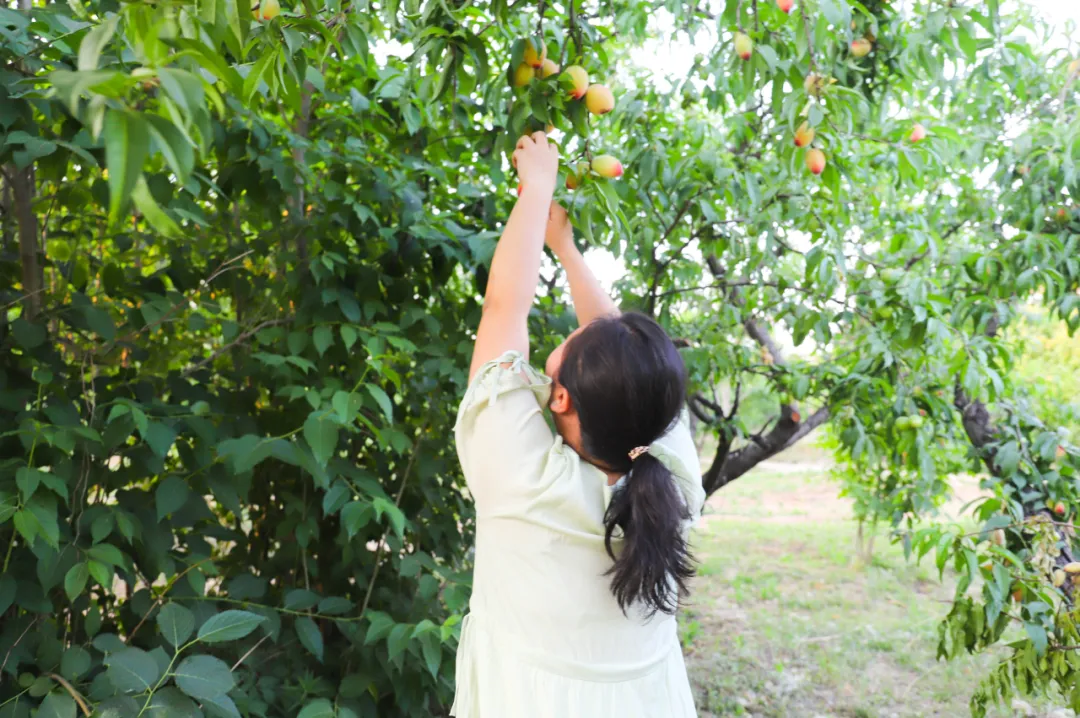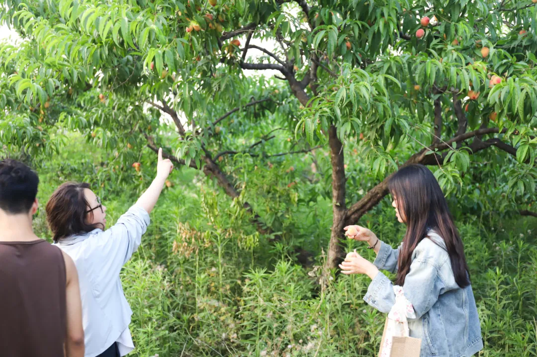 老师们一个个兴高采烈地踏入桃园,眼中闪烁着期待的光芒。有的老师微微仰头,仔细观察着桃子的成熟度,脸上满是专注的神情;有的老师则小心翼翼地伸出手,轻轻捏住桃子,然后轻轻一转,桃子便稳稳地落入手中,他们的脸上随即露出满足的笑容;还有的老师一边采摘一边和旁边的同事愉快地交谈着,时不时发出爽朗的笑声,手中的动作却丝毫没有停顿。桃园中充满了愉快的氛围,大家都沉浸在这轻松的时刻,每个人的脸上都洋溢着欢快与喜悦。