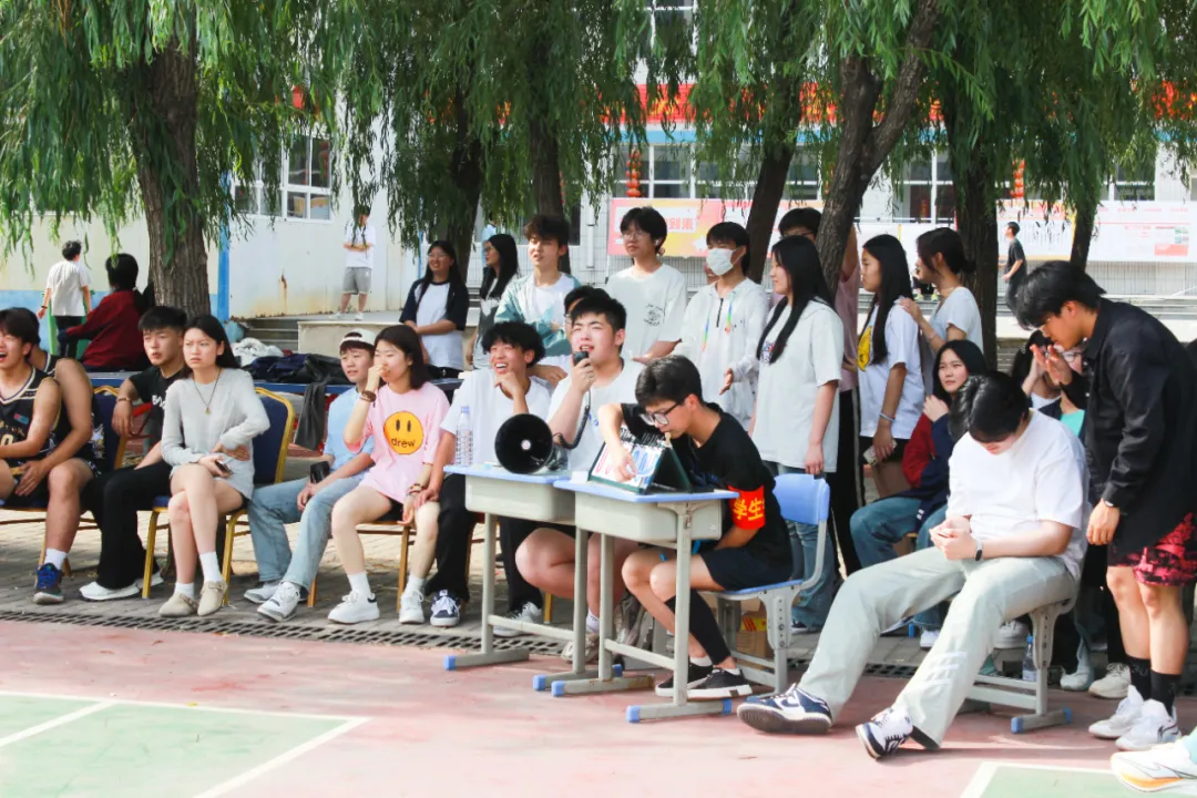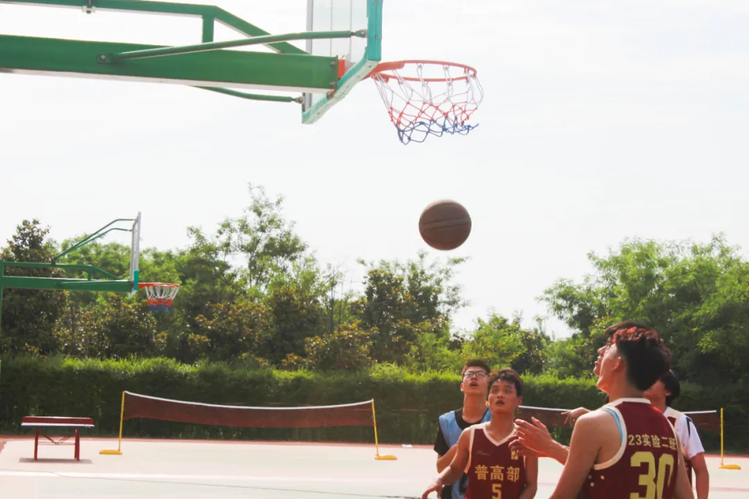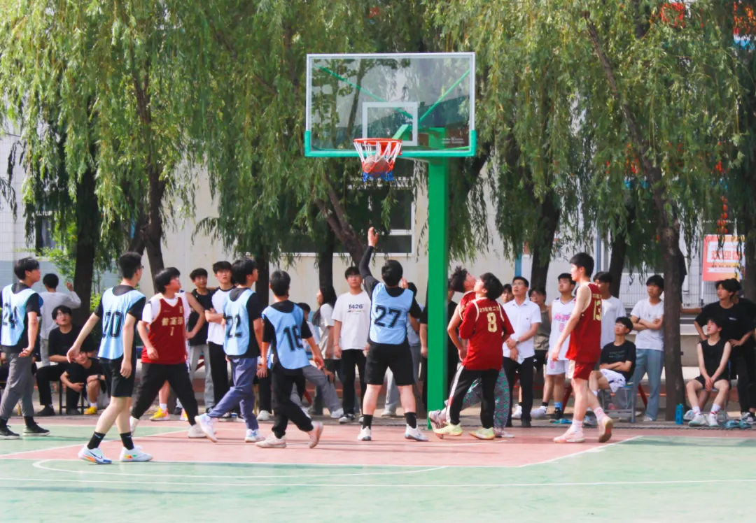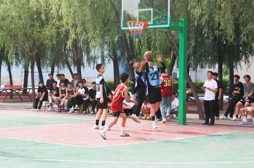 篮球场上,各班的篮球健儿们挥洒着青春的汗水,他们奔跑、跳跃、传球、投篮,每一个动作都充满了力量与活力。每一次精彩的进攻和防守,都赢得了观众们的阵阵喝彩与欢呼。场下的同学们也毫不示弱,他们组成了热情的啦啦队,用激昂的口号和欢呼声为球员们加油助威,成为了赛场上另一道亮丽的风景线。