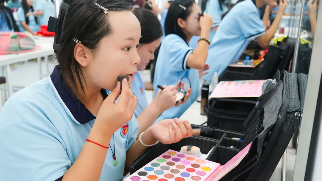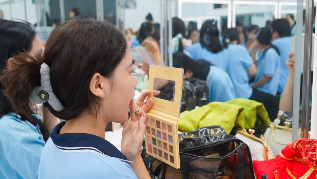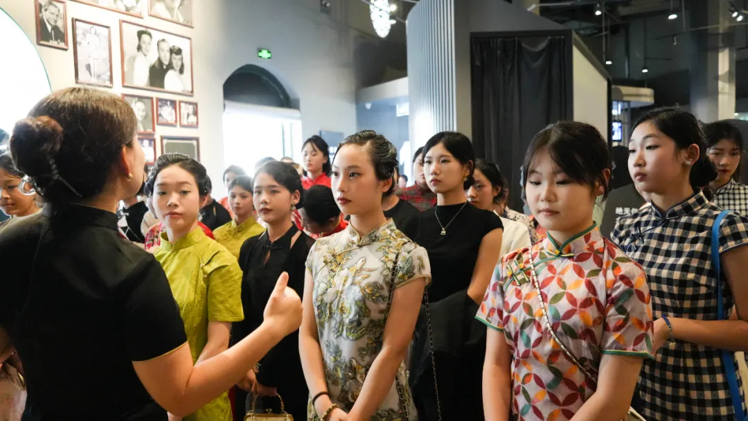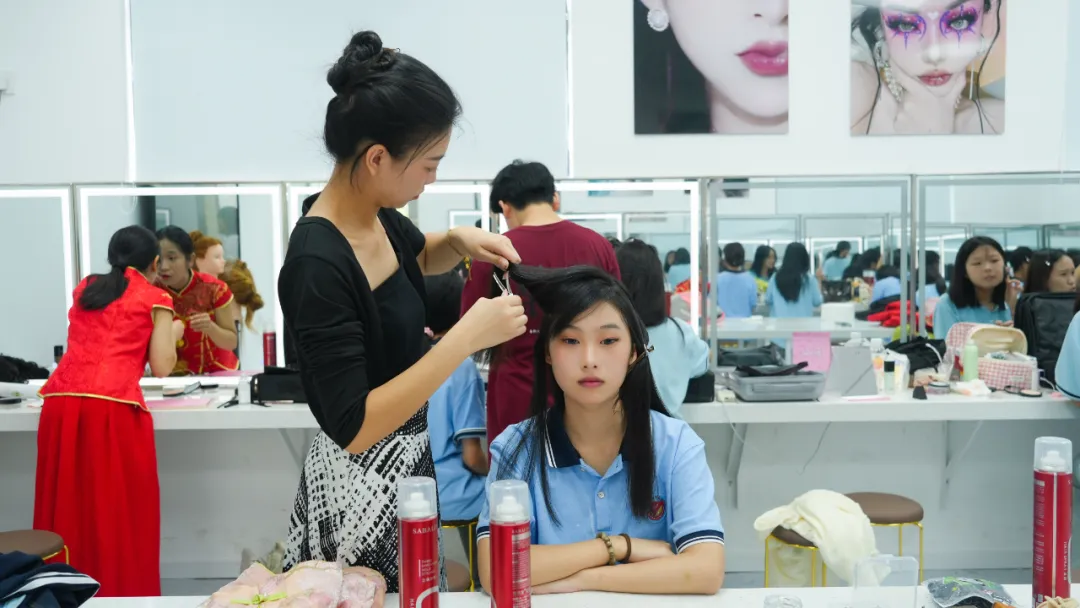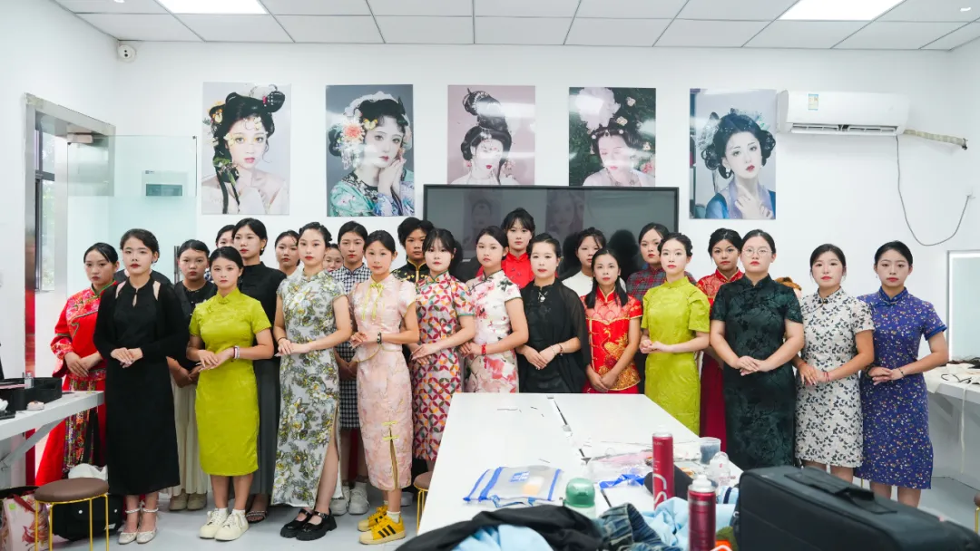 专业学生在学校自行进行装造变装,精心打造民国风格的造型。学生们换上旗袍,瞬间变身民国名媛,专业课老师则对妆造的细节进行细致调整。