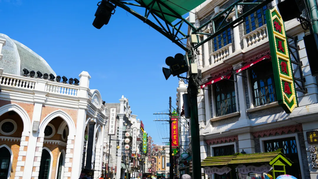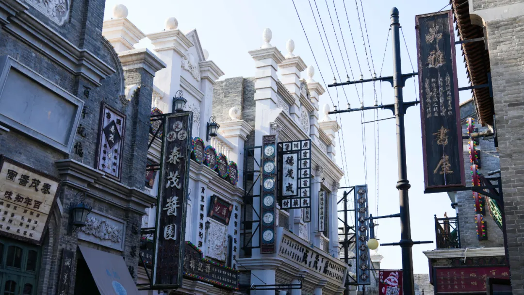 到达电影小镇后,学生们立刻被林立的建筑所吸引。这里复原了19世纪 20、30年代的郑州大同路、德化街等最具年代代表的标志建筑。身穿旗袍马褂的行人来来往往,仿佛穿越时空而来。学生们置身其中,感受着浓郁的民国氛围。