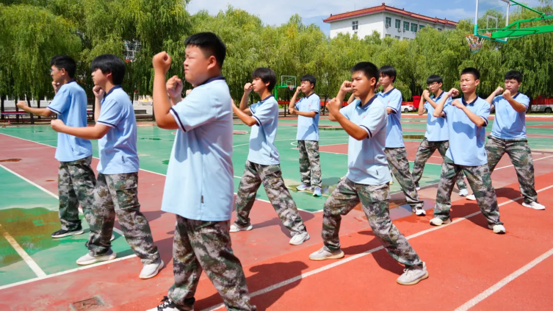 同学们身着整齐的校服,精神抖擞地站在操场上。随着激昂的音乐响起,他们迅速进入状态,动作刚劲有力,口号声震耳欲聋。出拳如风,踢腿似电,每一个动作都充满了力量和气势,展现出了青少年的蓬勃朝气和坚毅决心。他们的眼神中透露出坚定与自豪,仿佛在告诉人们,他们将继承和发扬军人的优良传统,为祖国的繁荣富强贡献自己的力量。观众们被同学们精彩的表演所感染,掌声雷动,欢呼声此起彼伏。