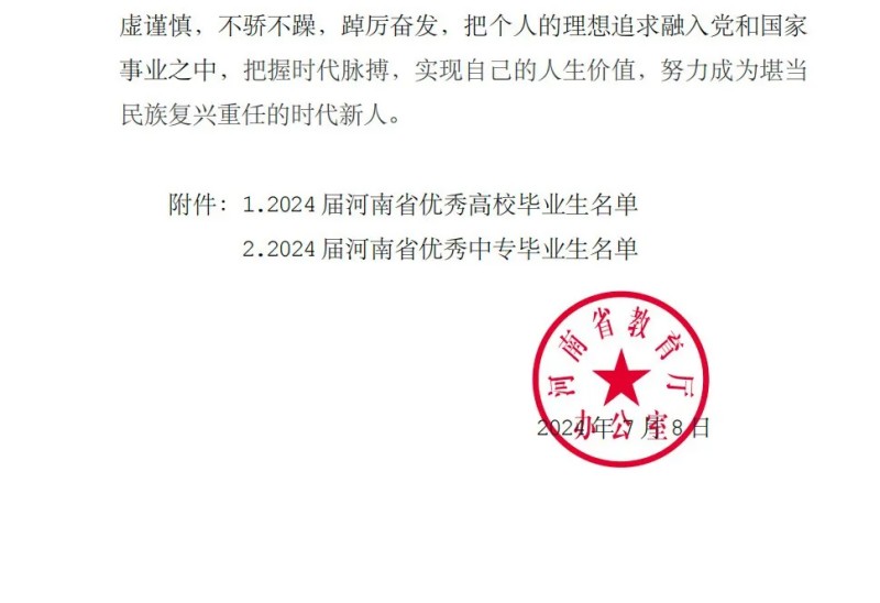 近日,河南省教育厅办公室正式发布了《关于公布2024届河南省优秀大中专毕业生认定结果的通知》(教办学〔2024〕213号),公布了2024届河南省优秀大中专毕业生名单,我校施权恒、归翠云等12名同学荣获“2024届河南省优秀大中专毕业生”荣誉称号。